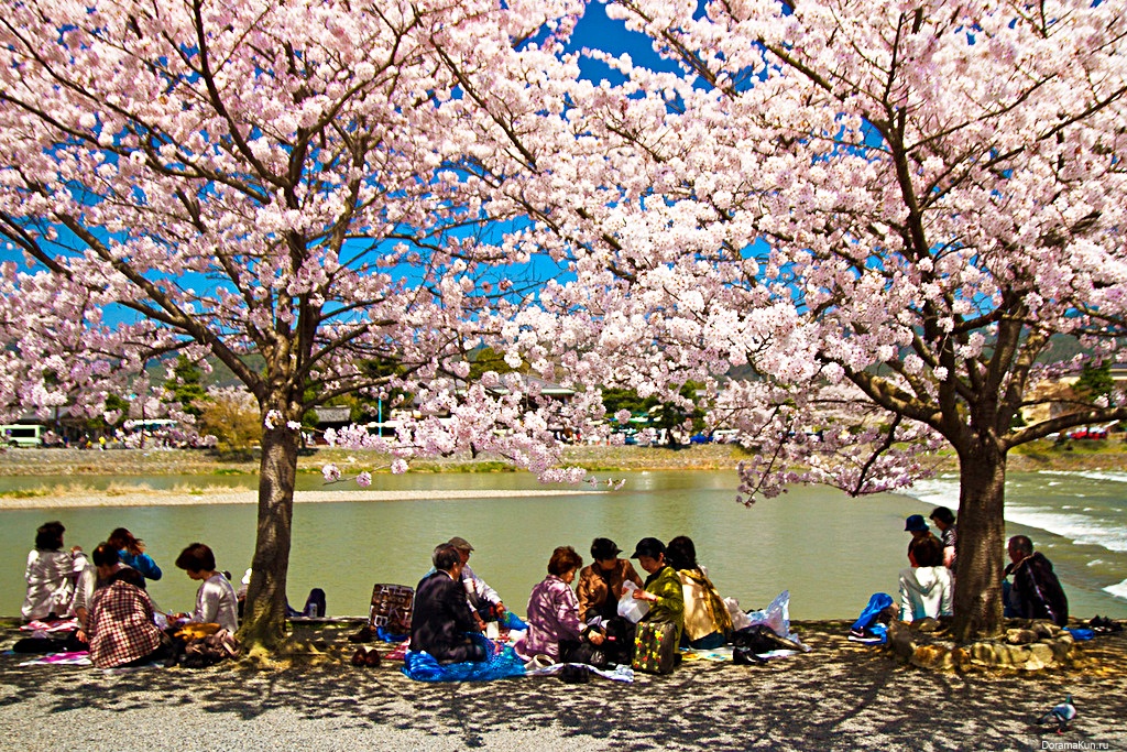 Во время Ханами, японцы собираются с семьей и друзьями под сакурой, чтобы наслаждаться красотой цветущих деревьев. Они расстилают коврики, приносят еду и питье, и проводят время в окружении аромата и красоты цветущих цветов.